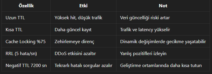 - Cache locking + RRL + DNSSEC bir arada kullanıldığında zehirleme ve fırtına trafiği baskılanır.