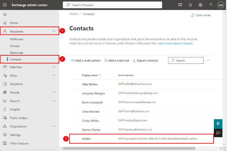 Not: HVE hesabı özel bir posta kullanıcı hesabıdır, bu yüzden Exchange yönetim merkezindeki Kişiler bölümünde de göreceksiniz.